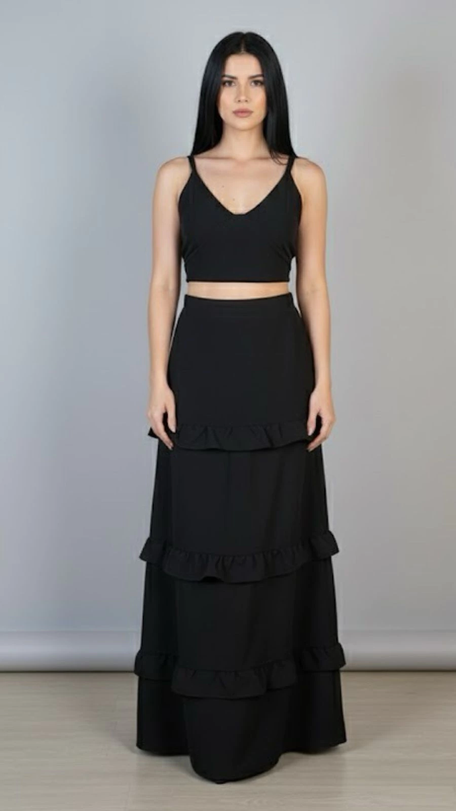 A saia com três babados traz movimento e feminilidade ao look, tornando-o ideal para ocasiões especiais ou para o dia a dia com um toque de requinte. Aposte nessa combinação que une conforto, versatilidade e um design moderno.