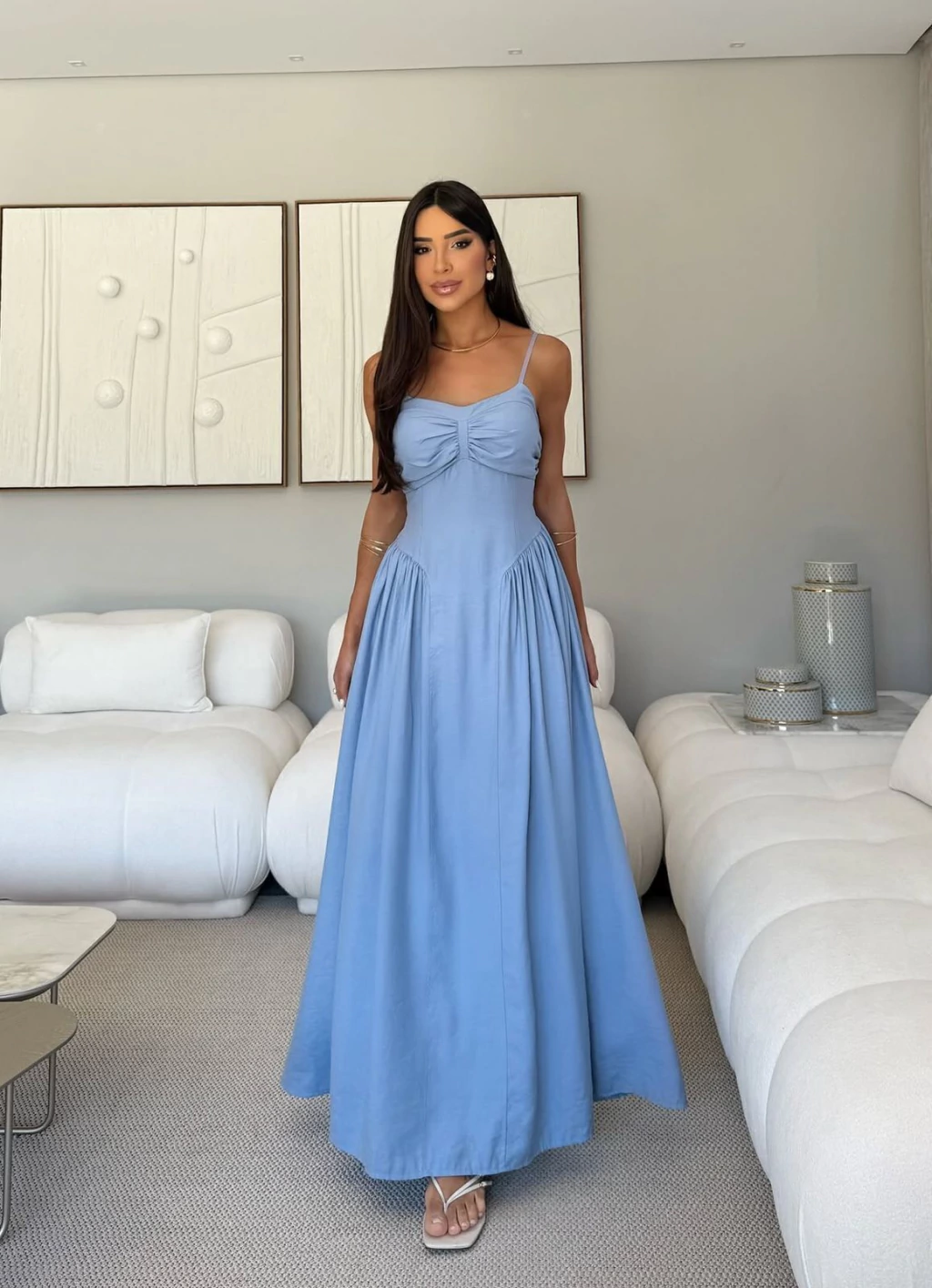 O design do vestido traz um laço delicado que valoriza o decote, enquanto a modelagem longa proporciona um caimento fluido e moderno. Perfeito para ocasiões especiais ou para quem deseja um visual marcante e cheio de estilo.